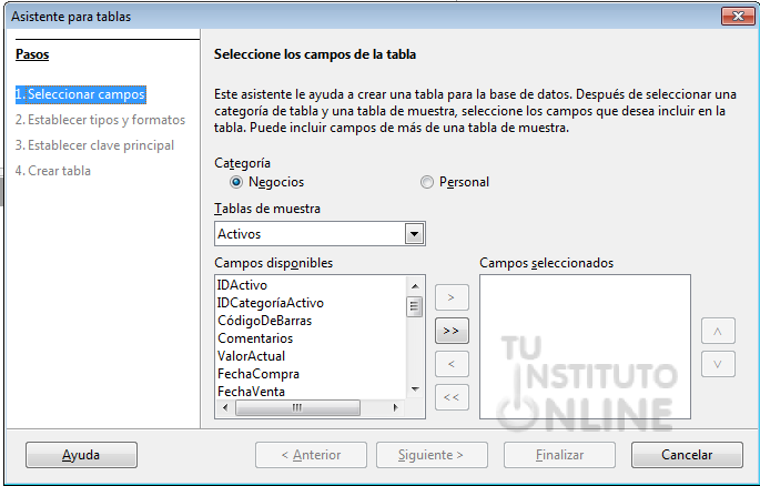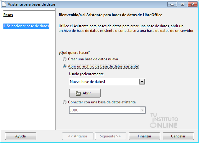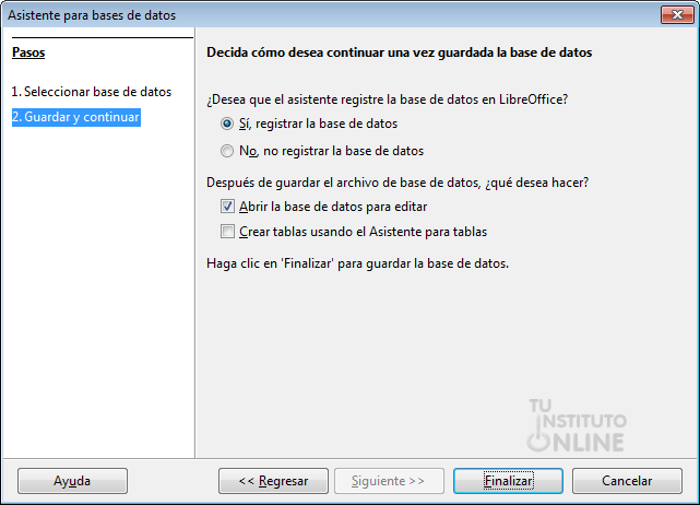 Nos mostrará las mismas opciones que nos mostró al crear la base de datos (de registro y de apertura) activadas. Dejaremos los valores como están y pulsaremos Finalizar, lo que abrirá un diálogo para escribir el nombre de la base de datos.