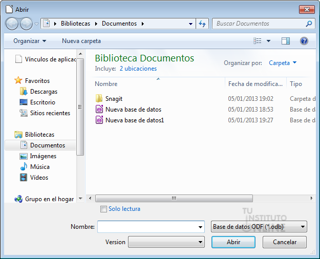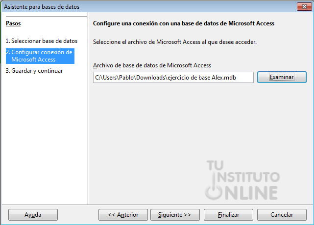 En la ventana que se muestra seleccionaremos el fichero de base de datos de Access pulsando el botón Examinar o escribiendo la ruta: