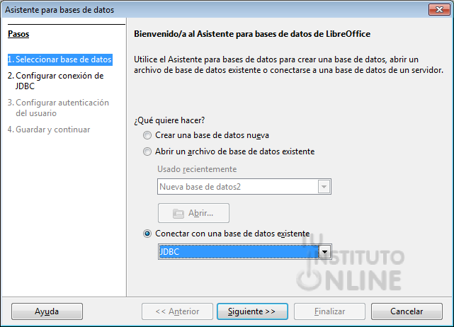 Si lo que queremos es conectar con alguna base de datos existente seleccionaremos la opción Conectar con una base de datos existente. Para abrir una base de datos existente selecionaremos la primera opción Abrir un archivo de base de datos existente y seleccionaremos el tipo de conexión que queremos de entre las existentes. Dependiendo del tipo de conexión, las pantallas siguientes cambiarán.