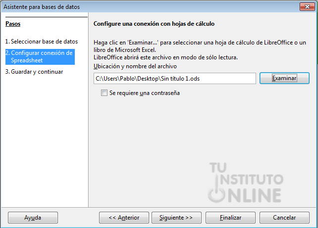 En este ejemplo seleccionaremos Hoja de cálculo y pulsaremos el botón Siguiente. Deberemos seleccionar la hoja de cálculo donde hemos almacenamos los datos e indicaremos si ésta requiere una contraseña (de protección) o no. Pulsaremos el botón Siguiente.