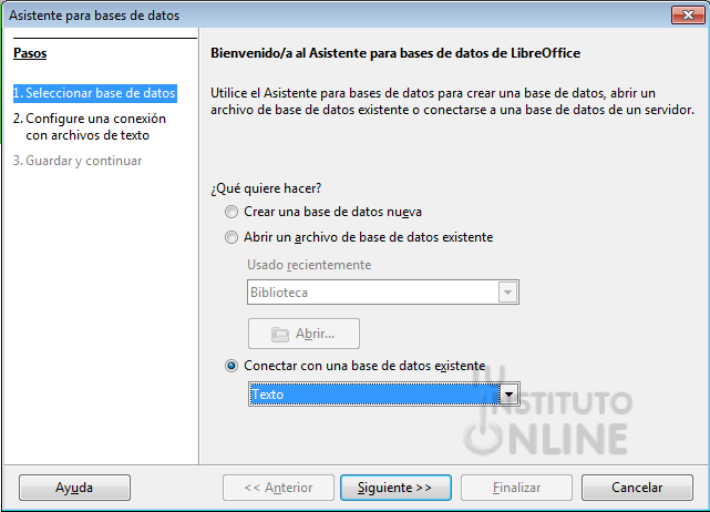 Vamos a explicar ahora otro ejemplo sencillo: un fichero de texto. Para ello seleccionaremos la opción de Texto y pulsaremos el botón Siguiente.