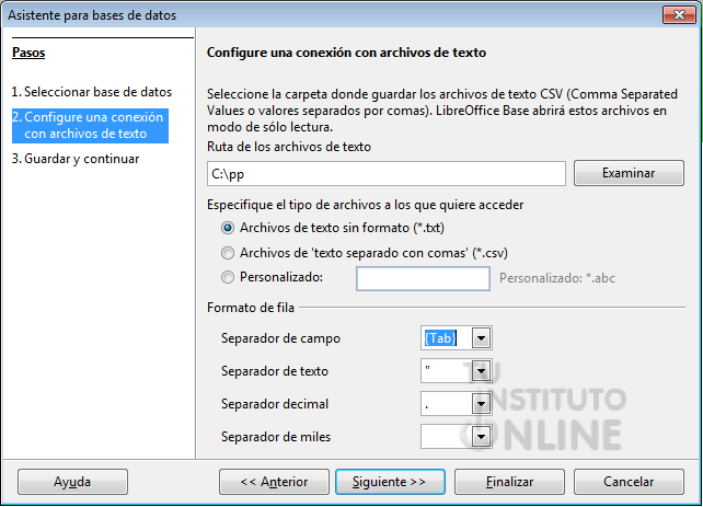 Se mostrará otra ventana en la que podremos seleccionar el fichero de texto (la ruta del lugar donde se encuentra). Además se deberá seleccionar los caracteres que se están utilizando para distinguir un campo de otro en cada fila. En el ejemplo los campos están separados por tabuladores, por ello seleccionaremos, en el apartado Selector de campo la opción {Tab}.