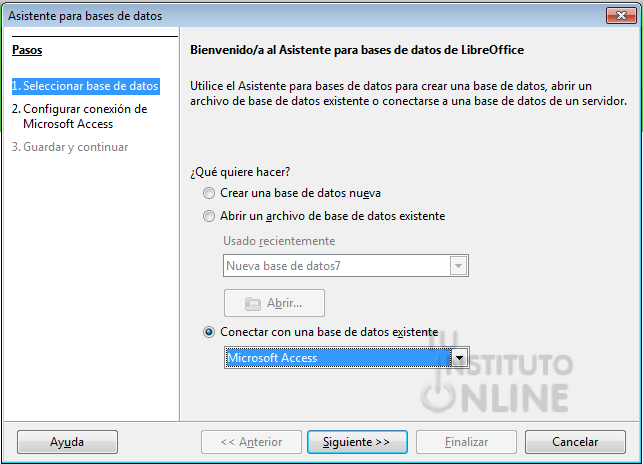 Para terminar los ejemplos haremos uno con una base de datos de Microsoft Access. Para ello seleccionaremos la opción de Microsoft Access y pulsaremos el botón Siguiente.