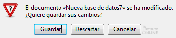 Si la base de datos está almacenada se cerrará, pero si no se ha almacenado mostrará un mensaje indicando que si se desean almacenar o descartar los cambios: