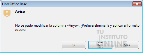 El cambio en el tipo de datos ha de realizarse con cautela, ya que se tendrá que seleccionar un tipo de datos compatible con los valores ya introducidos (en caso de que la tabla contenga datos).