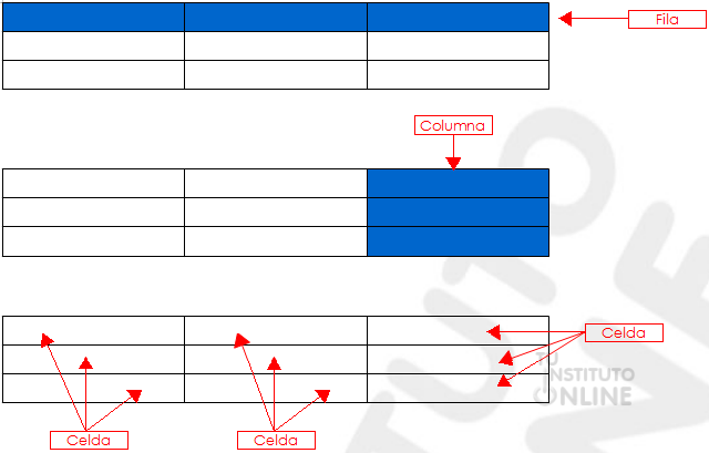 A la intersección de una columna y fila se le denomina celda. Las celdas se identifican por sus posiciones en las filas y las columnas. Las celdas están separadas por líneas que pueden tener estilos, grosores y colores diferentes. El fondo de las celdas puede colorearse o tener una textura determinada.