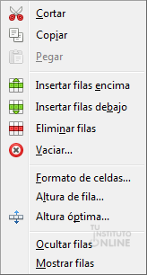 Si deseamos insertar una fila, utilizaremos el botón derecho del ratón para pulsar sobre la fila que se encuentra encima o debajo de la cual deseamos insertar la nueva fila y luego, desde el menú contextual, pulsaremos Insertar filas encima/Insertar filas debajo.