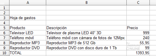 En las prácticas siguientes vamos a trabajar sobre el mismo fichero "gastos", rellenándolo con los datos y elementos que se pidan. Cuando terminemos la práctica de "fórmulas sencillas", subiremos el archivo.