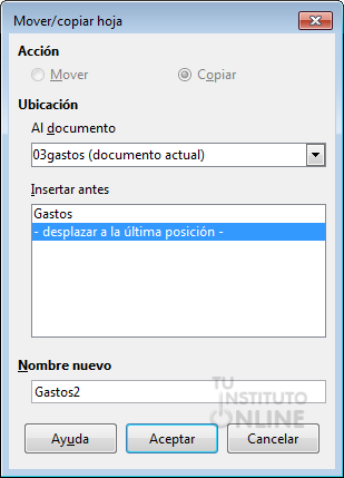 Haz clic en la etiqueta “Gastos” (parte inferior izquierda). Con el botón derecho del ratón elige la opción Mover o copiar hoja.