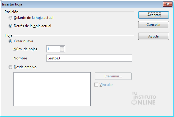 Marca “Detrás de la hoja actual” y pon como nombre “Gastos3”.