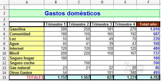Añade una nueva columna a la derecha de "Total año" para calcular el porcentaje de cada gasto sobre el total. La fórmula será: % sobre Total = Total año / Total