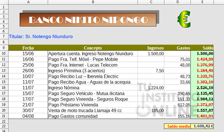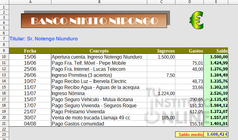 Para la 1ª línea (E10): Saldo = Ingresos – Gastos