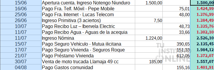 Para las restantes líneas (E11 y siguientes): Saldo = Saldo línea anterior + Ingresos - Gastos