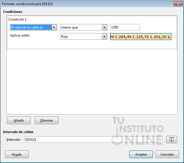 Muestra los números en rojo para aquellos valores inferiores a 1500 €.