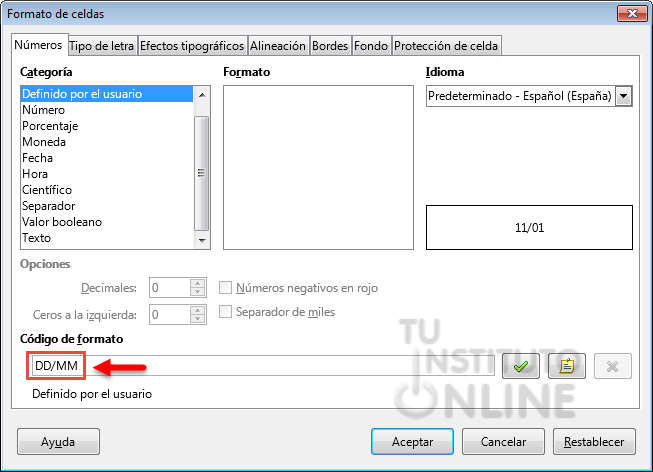 En Código de formato escribe "DD/MM" y haz clic en Aceptar.