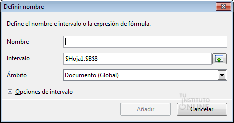 Para definir un nombre, iremos también al menú Insertar → Nombres → Definir. En el campo Intervalo establecemos el rango de datos sobre el que se aplicará dicho nombre.