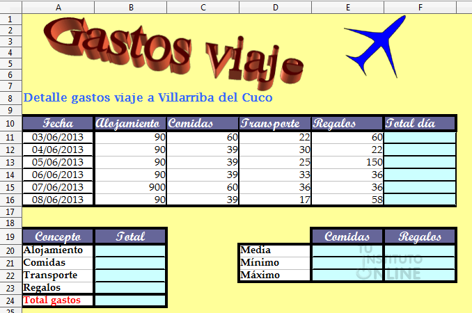 Total día = Alojamiento + Comidas + Transporte + Regalos → para la celda F11 tenemos =SUMA(B11:E11)