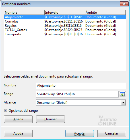 Ve al Menú Insertar → Nombres → Gestionar. Ahora se mostrarán todos los nombres definidos en nuestra hoja de cálculo. Al final tendremos: