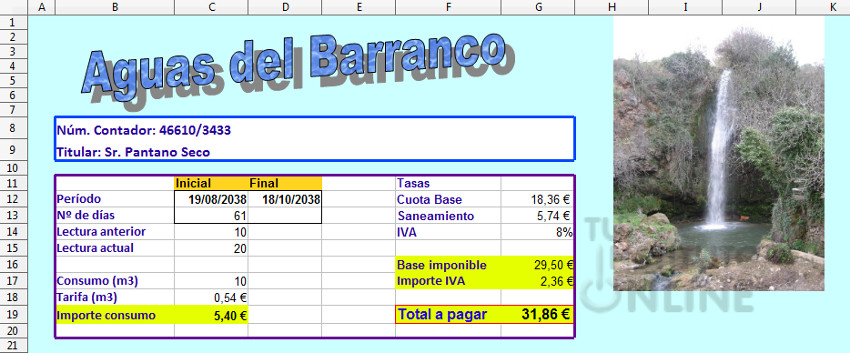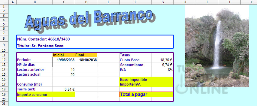 La empresa Aguas del Barranco quiere automatizar su factura en una hoja de cálculo.