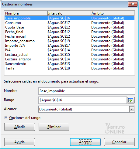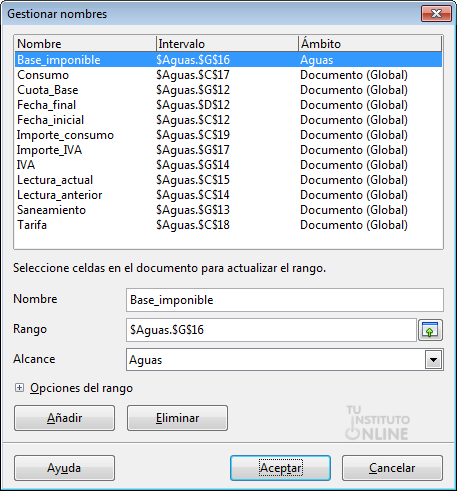 Ve al menú Insertar → Nombres → Gestionar. Elige el nombre "Base_imponible". En el campo Alcance, cambia el valor a "Aguas".