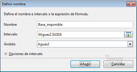 Define un nuevo nombre "Base_imponible" con ámbito en la hoja "Aguas2".
