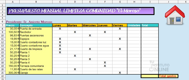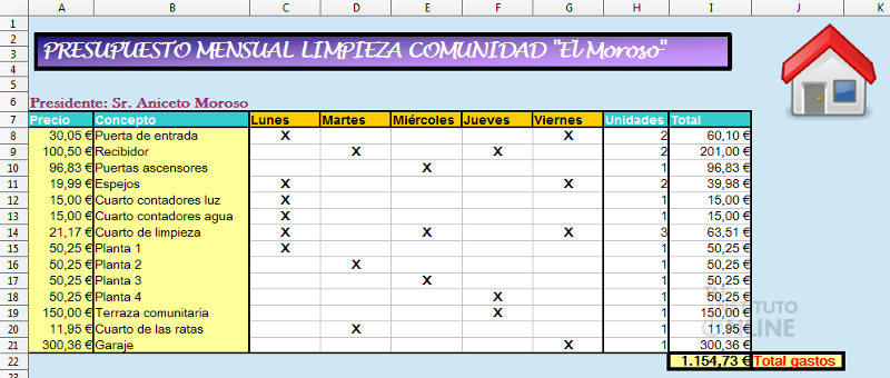 Crea un cuadro de texto con el texto “Presupuesto mensual limpieza comunidad El Moroso”.