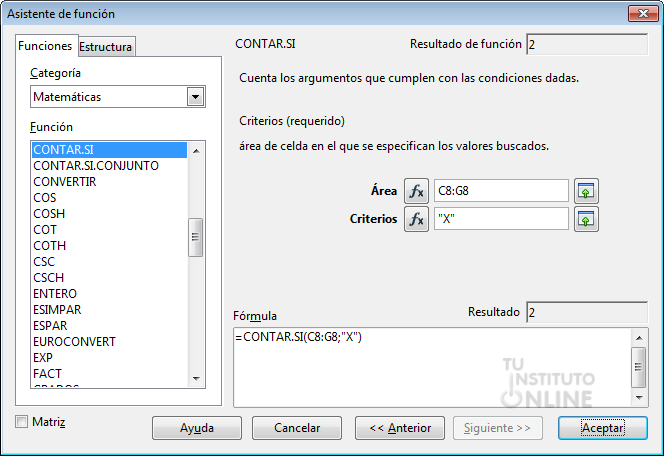 Ve a la celda H8. Mediante el asistente, elige la función CONTAR.SI y con el ratón marca el rango de celdas de C8 a G8. En criterios escribe “X”. Por último, pulsa Aceptar.