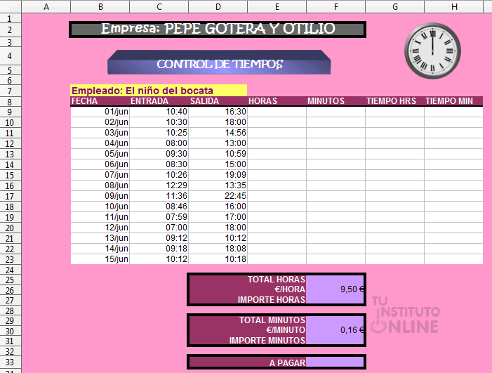 Pon formato Moneda con dos decimales a las celdas de Importe horas, Importe minutos y A pagar.