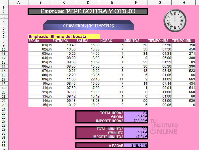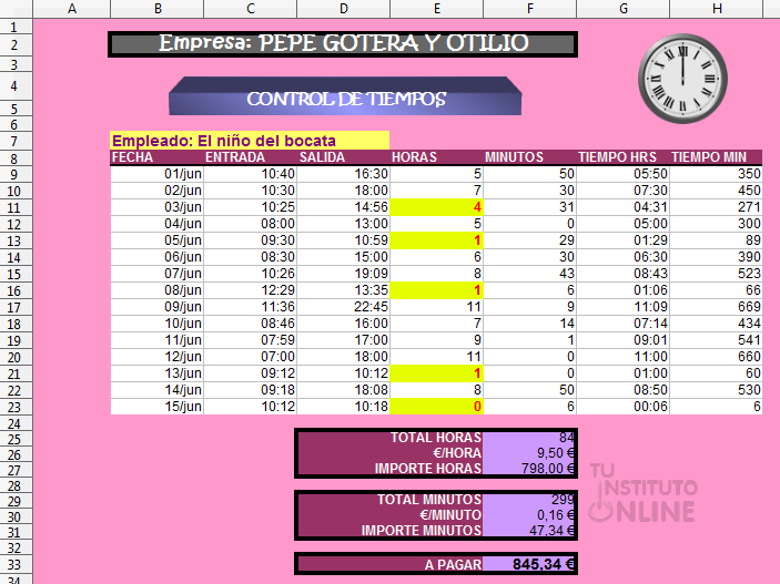 Se quiere calcular la nómina de un empleado en base a los tiempos que ha fichado diariamente.