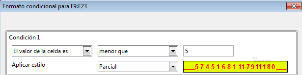 Define un formato condicional para la columna de Horas con el menú Formato → Formato condicional → Condición. Muestra los números con el estilo definido, para aquellos valores de hora menores de 5.