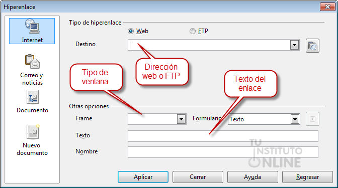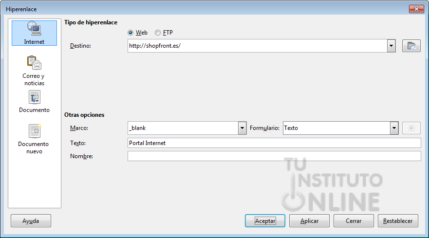 Seleccionaremos el tipo de hiperenlace, rellenaremos los parámetros de éste y pulsaremos Aplicar.