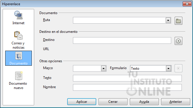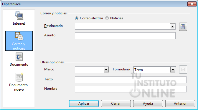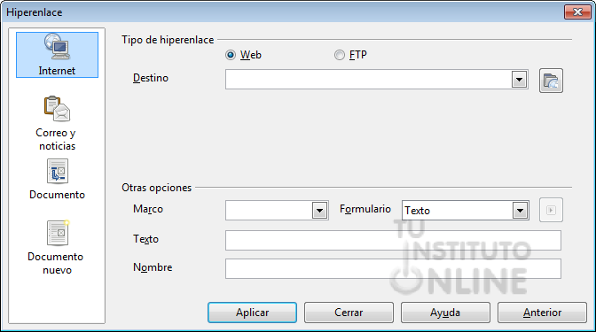 Como hemos podido observar, en la parte izquierda de la ventana se muestra un listado de los diferentes hipervínculos que podemos configurar: