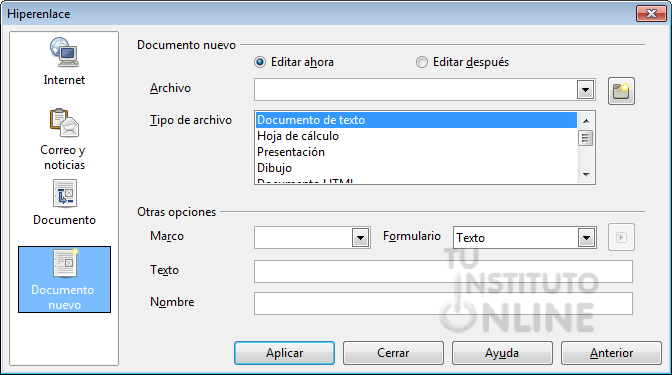 Podemos crear un hiperenlace a un documento nuevo y crear dicho documento al mismo tiempo. También dispone de un conjunto de opciones como: