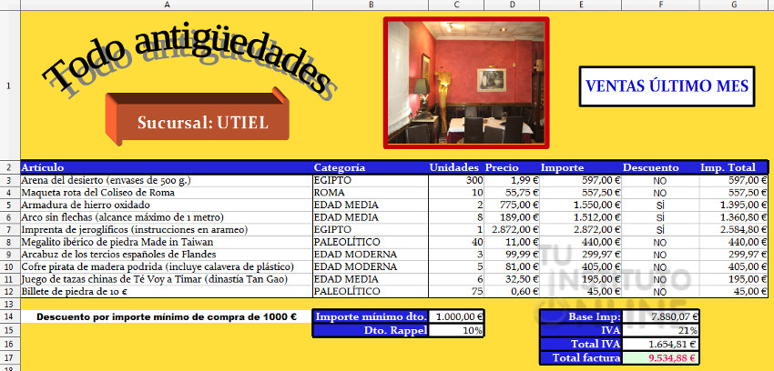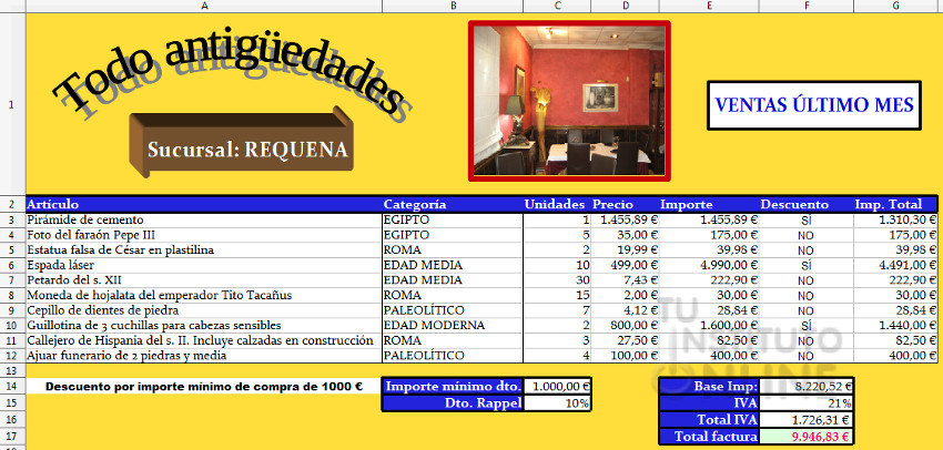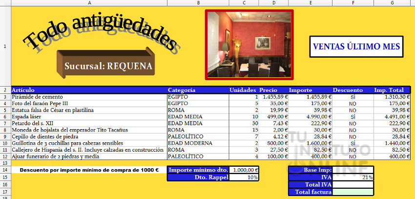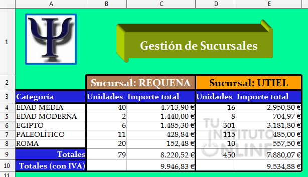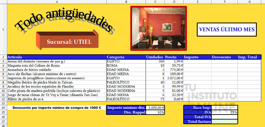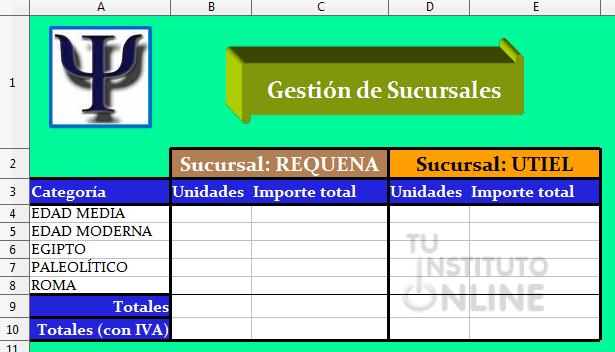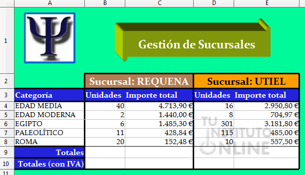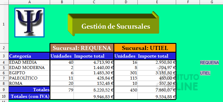 El anticuario "Todo antigüedades" dispone de 2 sucursales ubicadas en 2 poblaciones distintas de la provincia de Valencia: Requena y Utiel. El gerente de la tienda quiere automatizar la gestión de los dos puntos de venta en la misma hoja de cálculo. Para ello, usaremos tres hojas: 2 para las sucursales y una tercera para gestión global.