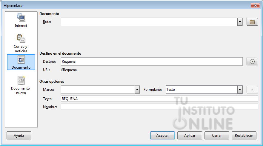 Destino: en esta segunda sección podemos indicar en qué parte del documento debe situarse después de abrirlo o bien a qué parte del propio documento debemos saltar.