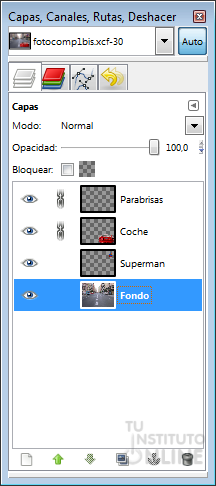 Para evitar problemas, si decidimos mover el coche de lugar y que las capas Coche y Parabrisas se muevan a la vez, podemos enlazarlas haciendo clic justo al lado del "ojo" de cada una de ellas. Así, aparecerá una cadena y las dos capas se moverán a la vez.