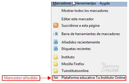 Ve al menú Marcadores → Añadir esta página a marcadores. Ahora, el explorador ha añadido a la lista la página que estamos visitando.