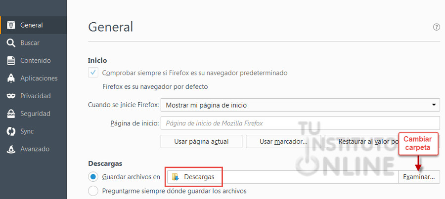 Para cambiar la ubicación de las descargas, iremos al menú Editar → Preferencias (Linux) o Herramientas → Opciones (Windows), pestaña General. Mediante el botón Examinar podemos cambiar la carpeta de descargas por defecto.