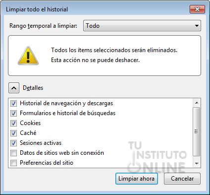 En la ventana de diálogo que se muestra podemos elegir si queremos borrarlo todo o la última hora, dos horas, etc. Deja por defecto Todo.