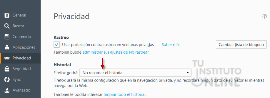 Vamos a poner por defecto que no se almacene nuestro historial de navegación.