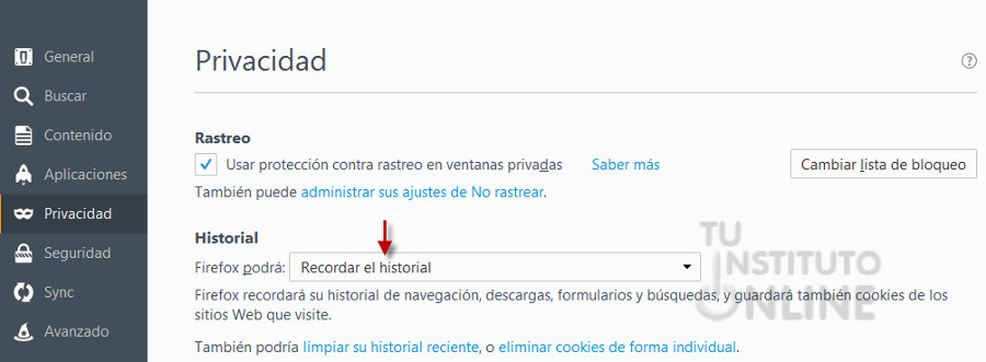 Ve al menú Editar → Preferencias (Linux) o Herramientas → Opciones (Windows), pestaña Privacidad. En el apartado Historial, despliega la lista y elige la opción "Recordar el historial".