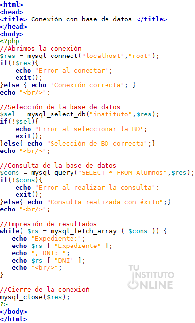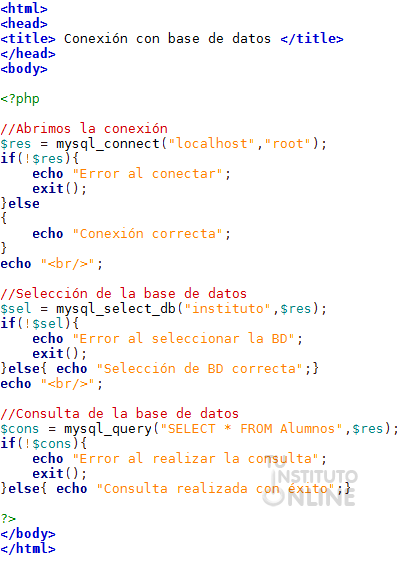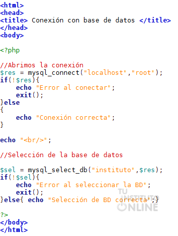 Los parámetros son: el nombre de la base de datos y el identificador devuelto por la función mysql_connect. Además devolverá TRUE en caso de éxito y FALSE en caso de error. Un ejemplo sería: