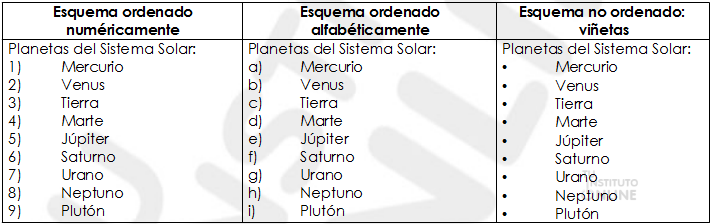 Un esquema es una manera de representar la información en forma de apartados. Estos apartados pueden estar ordenados (numérica o alfabéticamente) o no. Si no están ordenados, cada apartado recibe el nombre de viñeta. Veamos algunos ejemplos de todo esto: