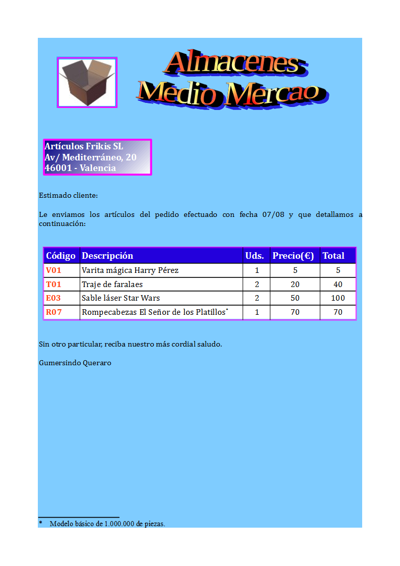 • Cuadro de texto. Inserta un cuadro de texto. Pon línea y color de área. Escribe el texto: Artículos Frikis SL Av/ Mediterráneo, 20 46001 - Valencia